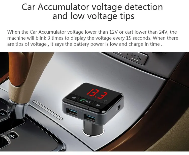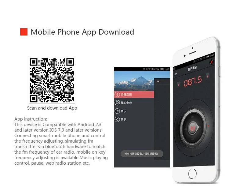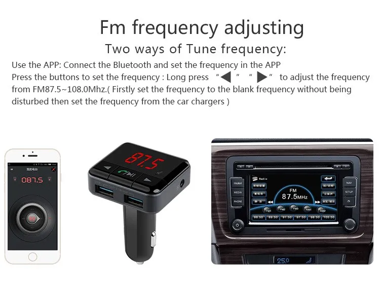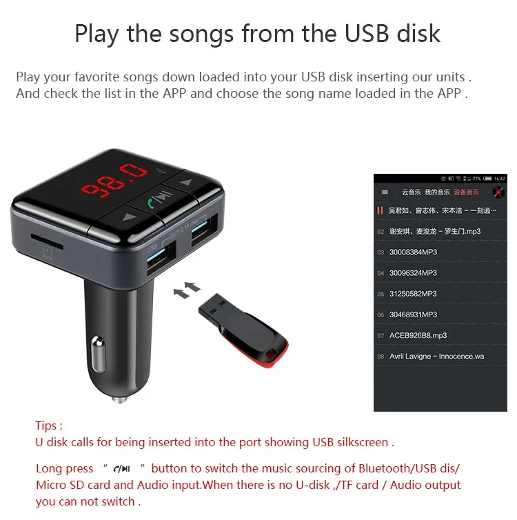 The product is designed as special Bluetooth Smart media player. It adopts advanced capability and professional Bluetooth module and WMA/MP3 decode chip. It can decode music files which you download to Micro SD card and USB disc,then transmit to your car audio through FM wireless transmitter, and easily enjoy music while driving. Vehicle intelligent Bluetooth use APP to control media playback, play / pause, Internet radio, FM Frequency and other functions.